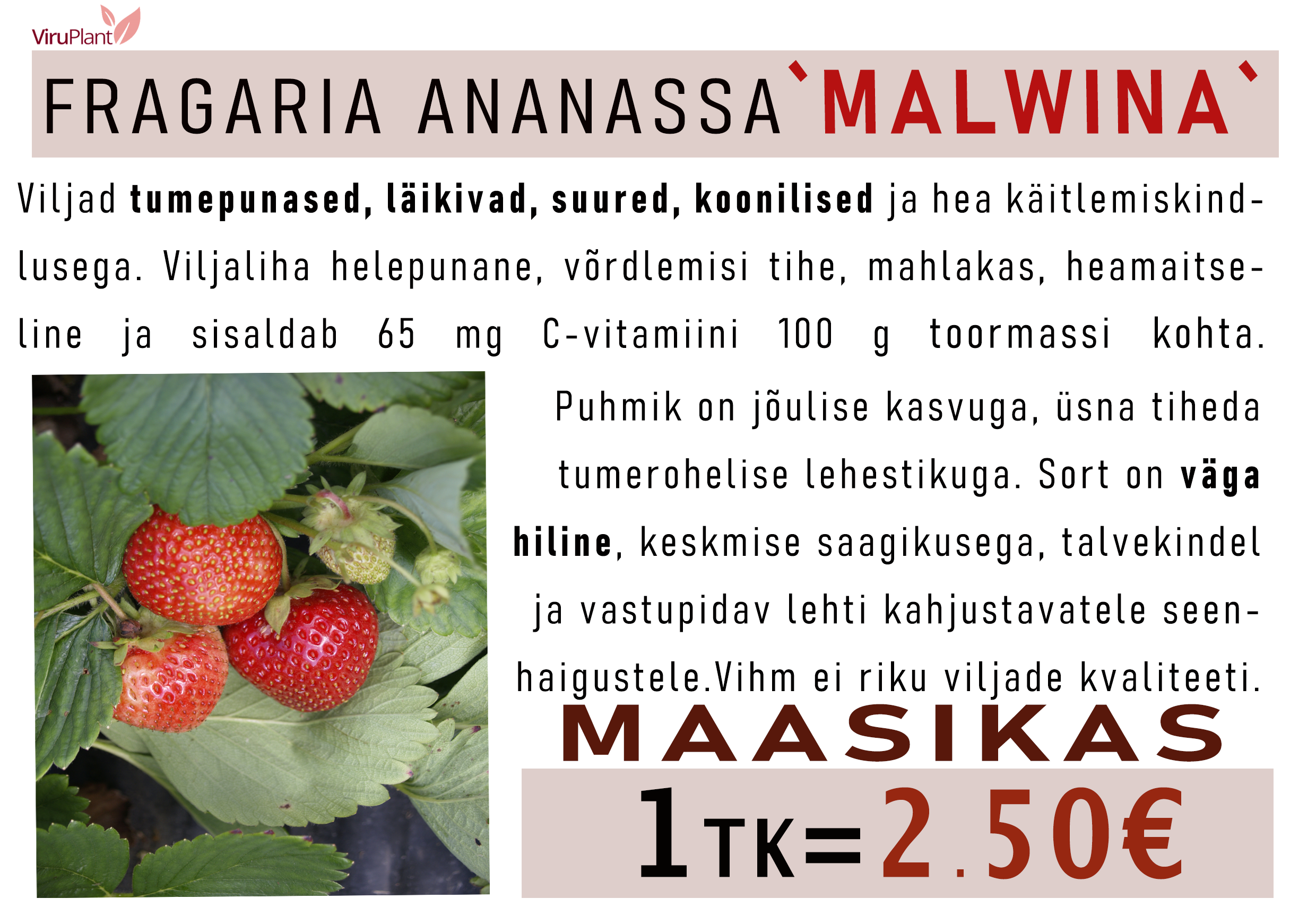 2.50 € 🍓 Hind: 2.50 €/tk 💥 10 tk – 20 € (2 €/tk) 👉 Üks hilisemaid sorte – väga magusad ja suured marjad Количество товара Aedmaasikas ‘Malwina’ В корзину Категория: Плодовые деревья и кустарники🍎 Акции 🍓 Клубника Описание Aedmaasikas ‘Malwina’ / Fragaria × ananassa